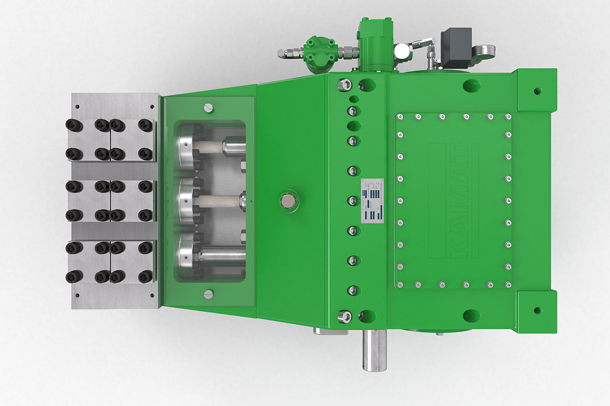 K35000高壓泵的驅(qū)動(dòng)功率為350 kW,非常適合噴射和液壓應(yīng)用。 例如,它經(jīng)常與大型移動(dòng)式噴射系統(tǒng)一起使用,已在化工行業(yè)服務(wù)多年,并在采礦行業(yè)滿足流量從400至600 l升/ 分鐘的需求。 在這種情況下,帶有強(qiáng)制潤(rùn)滑齒輪和油冷卻器的K35000可以滿足24/7全天候運(yùn)行的要求。 K35000高壓泵采用經(jīng)典的KAMAT模塊化組件系統(tǒng)構(gòu)建,因此可以靈活地適應(yīng)工作壓力和介質(zhì)等要求。 因此,它也經(jīng)常用于過(guò)程處理領(lǐng)域。